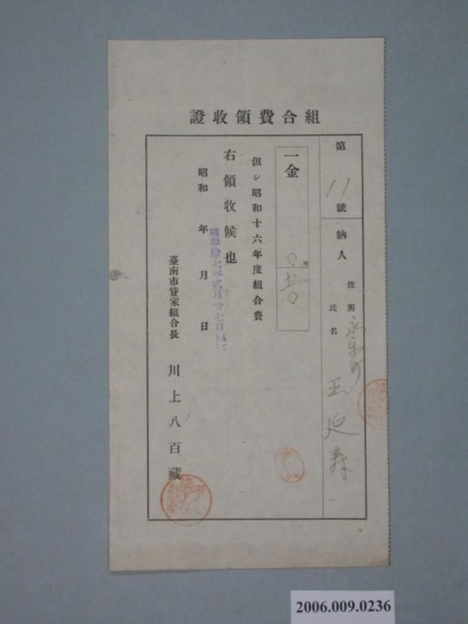 昭和17年臺南市貸家組合長給永樂町王延壽組合費收據