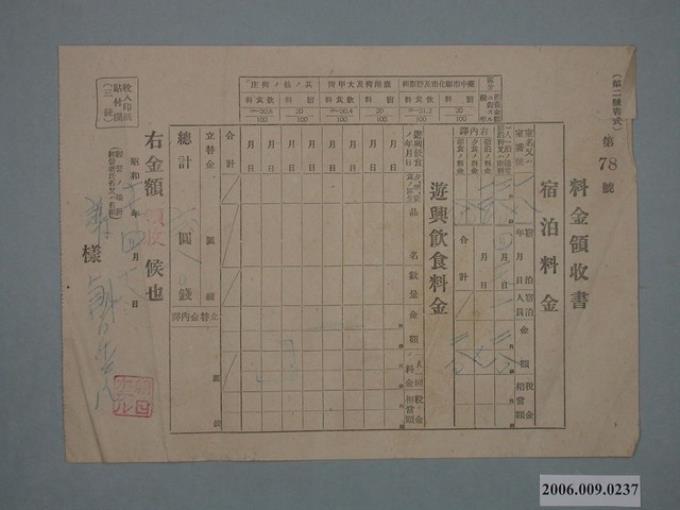 昭和17年朝日飯店給謝龍住宿費與餐費收據