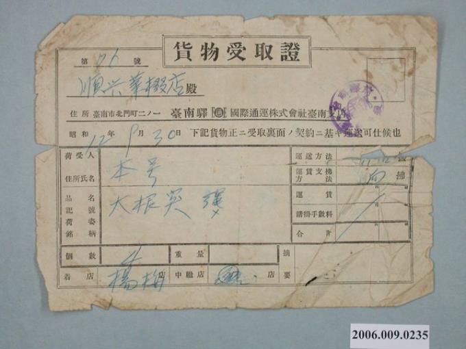 昭和12年國際通運株式會社臺南支店給順興業棳店貨物收據