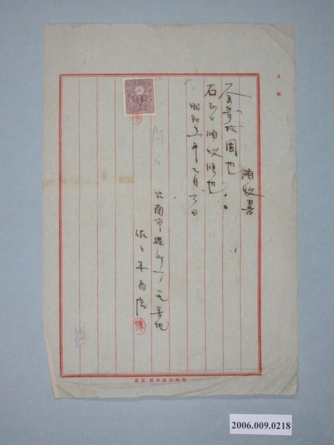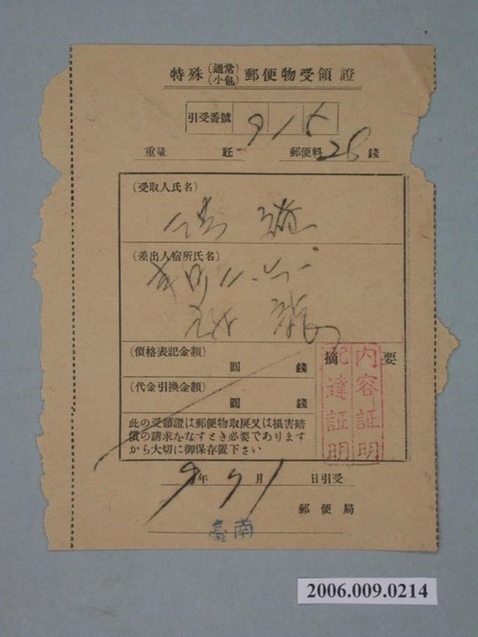 昭和9年臺南郵便局給洪繼特殊郵件領收證明