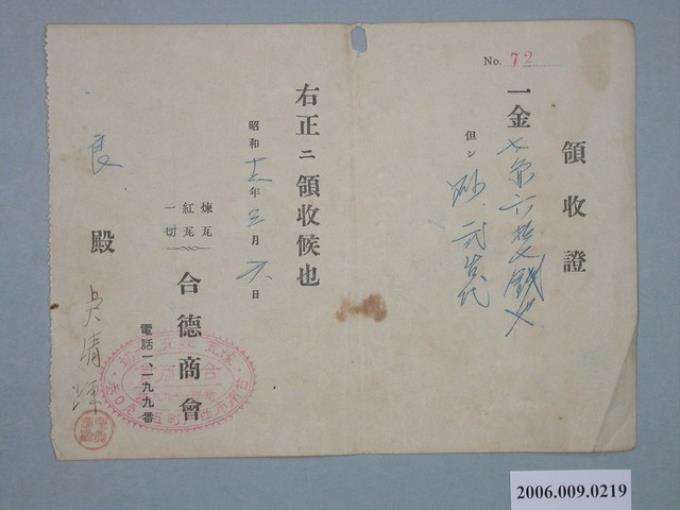 昭和11年臺南州新豐郡金瑞全公司給謝龍收據