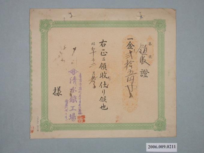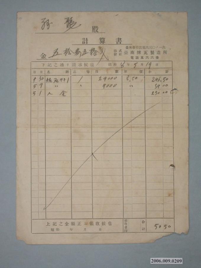 昭和8年臺南市煉瓦製造所給謝龍之款項計算書