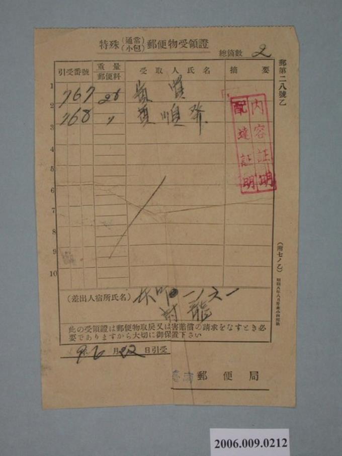 昭和9年臺南郵便局給黃買與黃順發特殊郵件領收證明