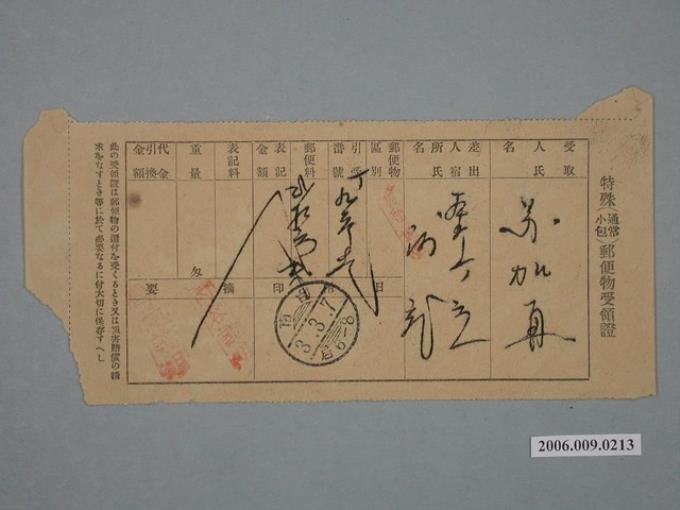 昭和3年臺南郵便局給蘇加再特殊郵件領收證明