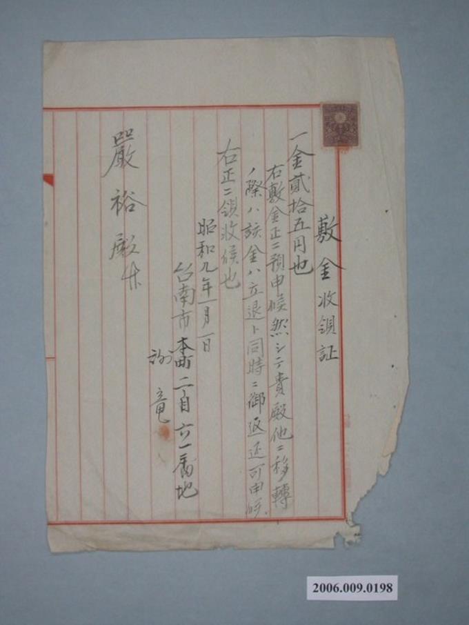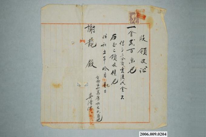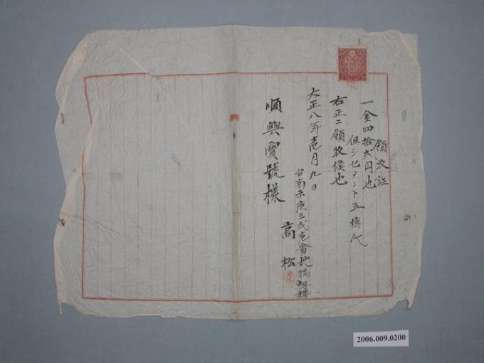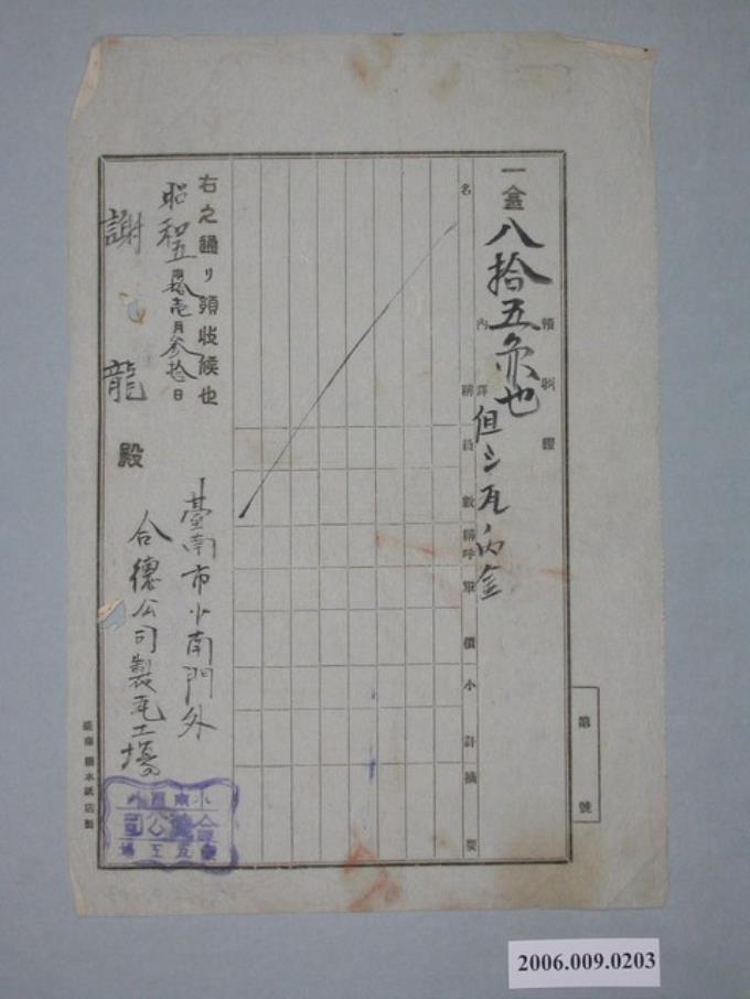 昭和5年臺南市合德公司製瓦工場給謝龍收據