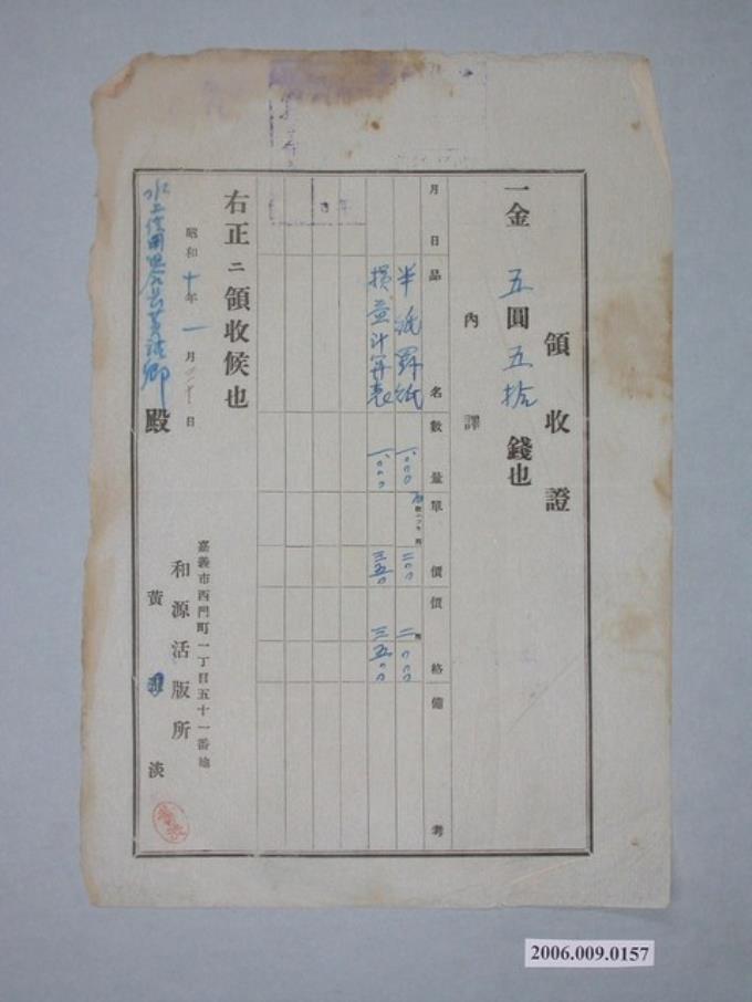 昭和10年嘉義市和源活版所給水上信用組合收據