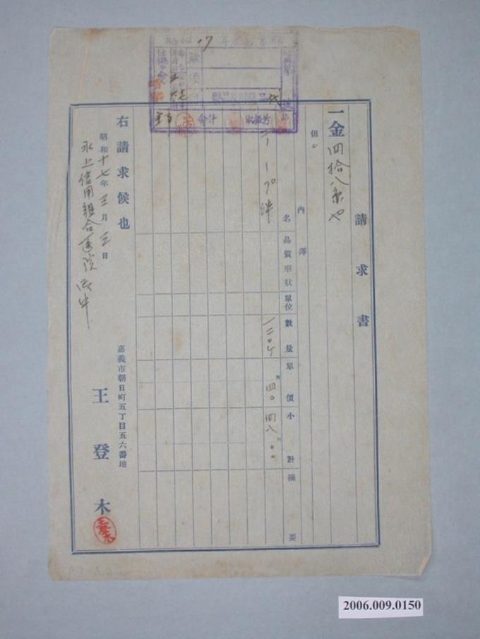 昭和17年嘉義市王登木給水上信用組合醫院請求書