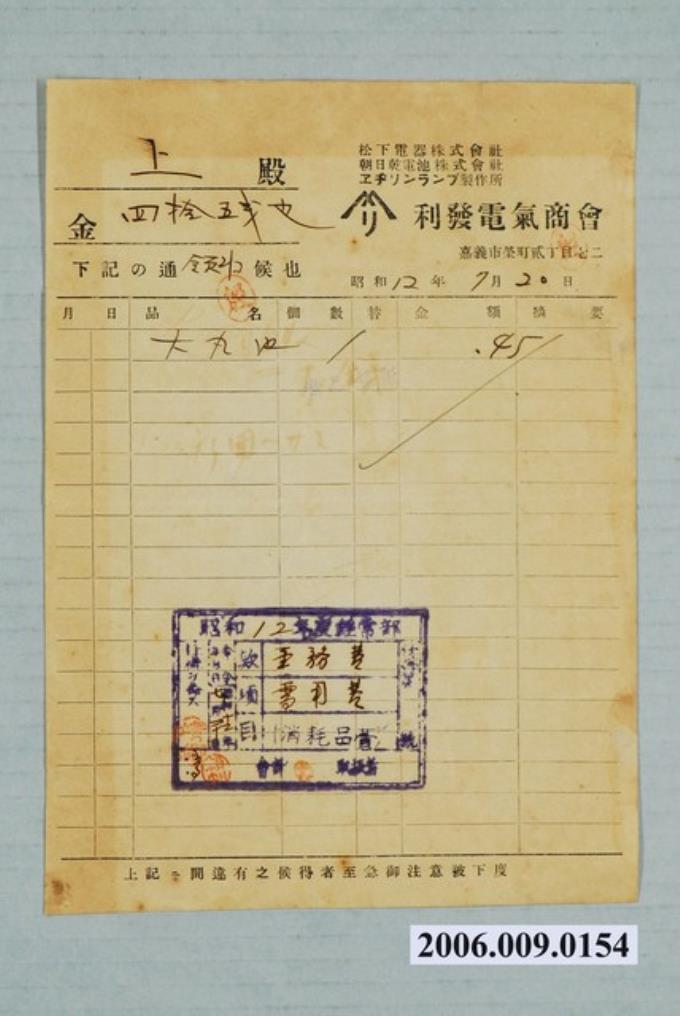 昭和12年嘉義市利發電氣商會給水上信用收據