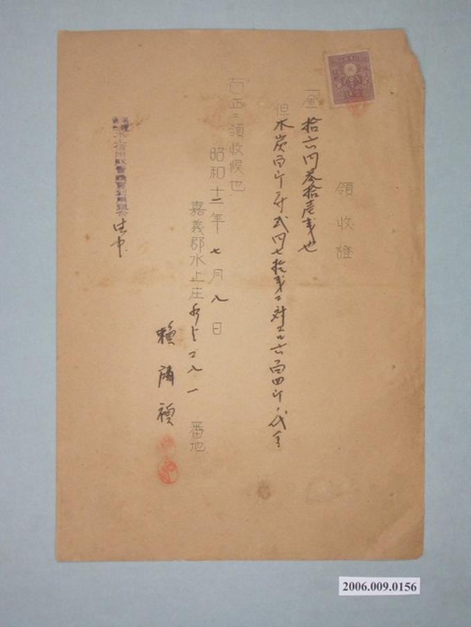 昭和12年嘉義郡水上庄賴麟禎給水上信用販賣購買利用組合收據