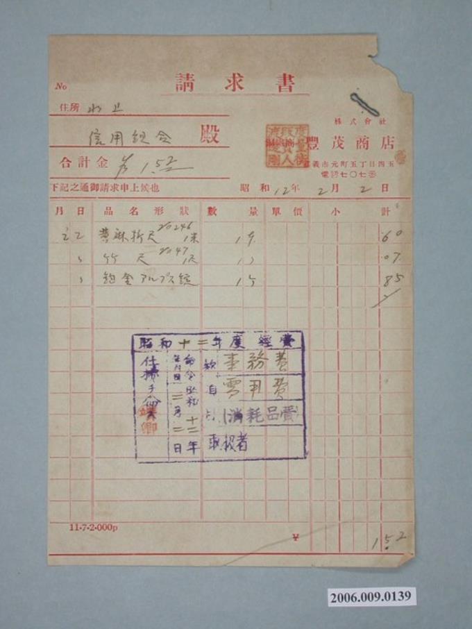 昭和12年嘉義市豐茂商店給水上信用組合請求書