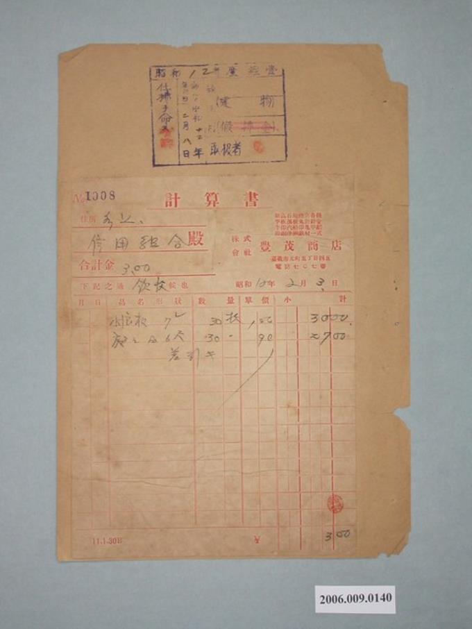 昭和12年嘉義市豐茂商店給水上信用組合之計算書
