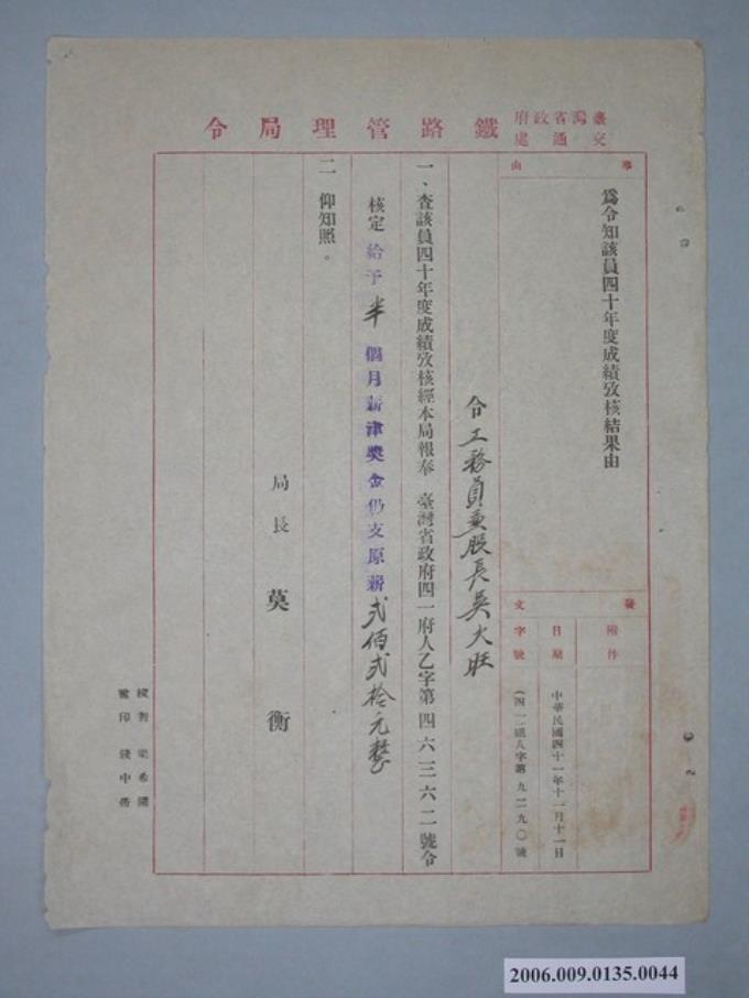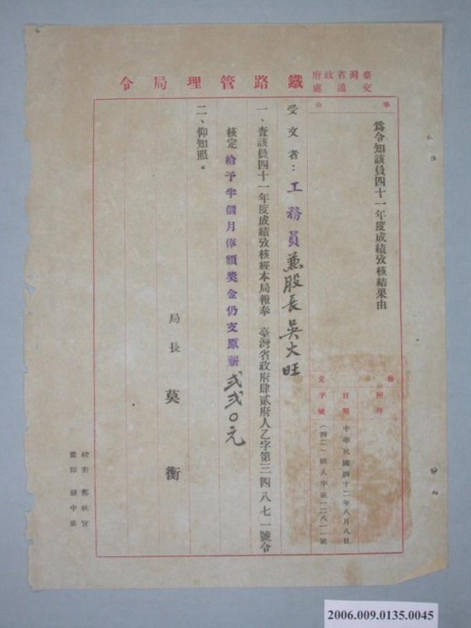 民國41年臺灣省政府交通處鐵路管理局工務員兼股長吳火旺年度獎金通知書