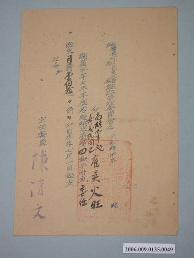 臺灣省行政長官公署交通處鐵路管理委員會嘉義機關區助役吳火旺調派令