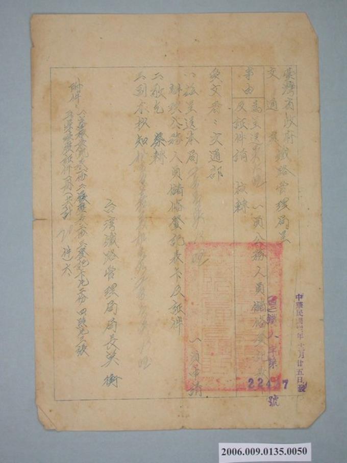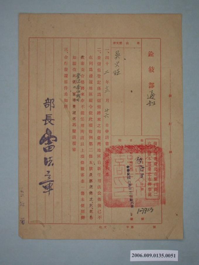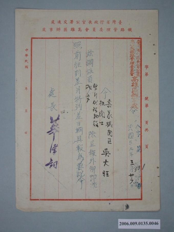 民國42年臺灣省政府交通處鐵路管理局呈送吳火旺儲備登記表公文