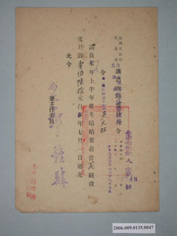民國37年臺鐵省政府交通處鐵路管理局嘉義機務段工務員吳火旺晉級令