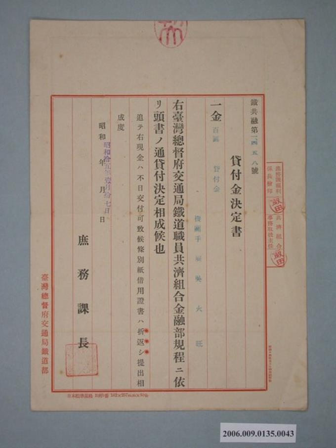 臺灣總督府交通局鐵道部機關手雇吳火旺貸款額決定書