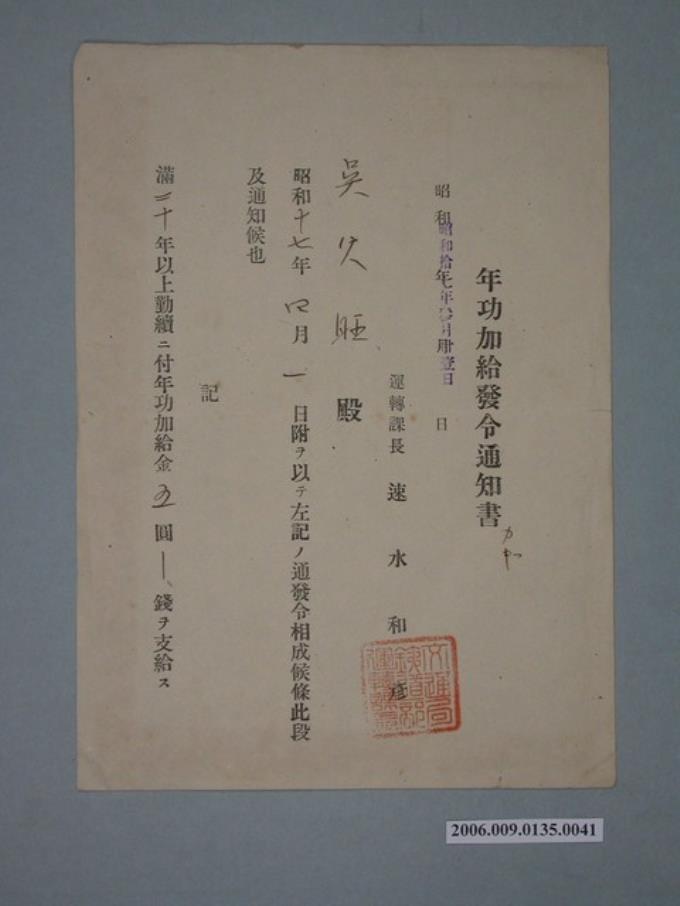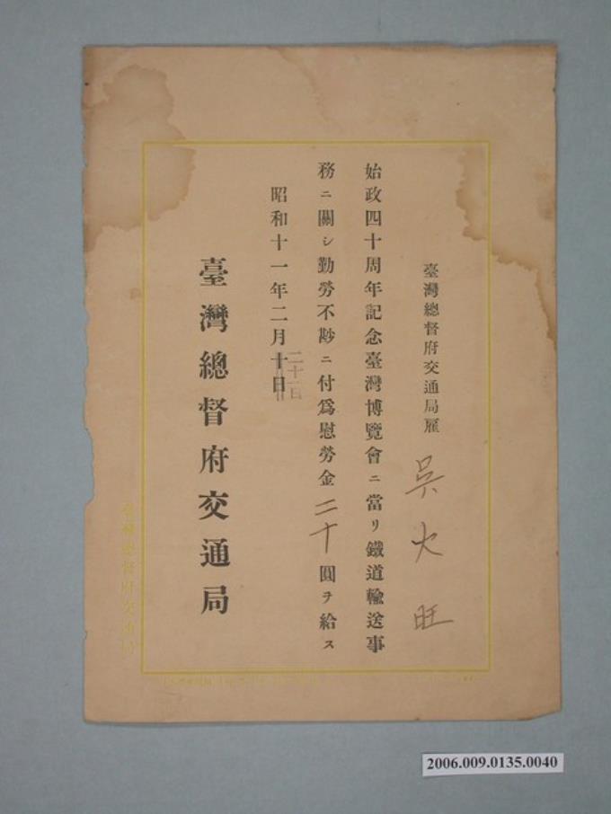 昭和11年臺灣總督府交通局雇吳火旺慰勞金通知書