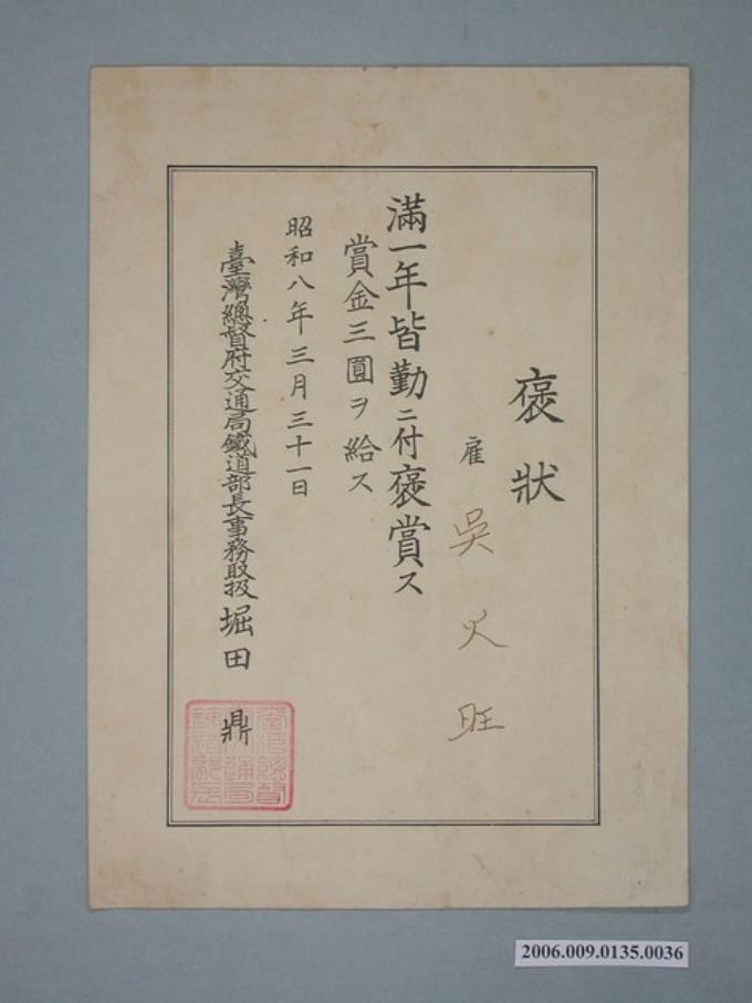 昭和8年臺灣總督府交通局鐵道部雇吳火旺獎狀