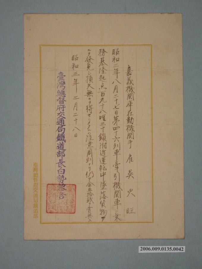 昭和3年臺灣總督府交通局鐵道部嘉義機關庫在勤機關手吳火旺獎賞通知書