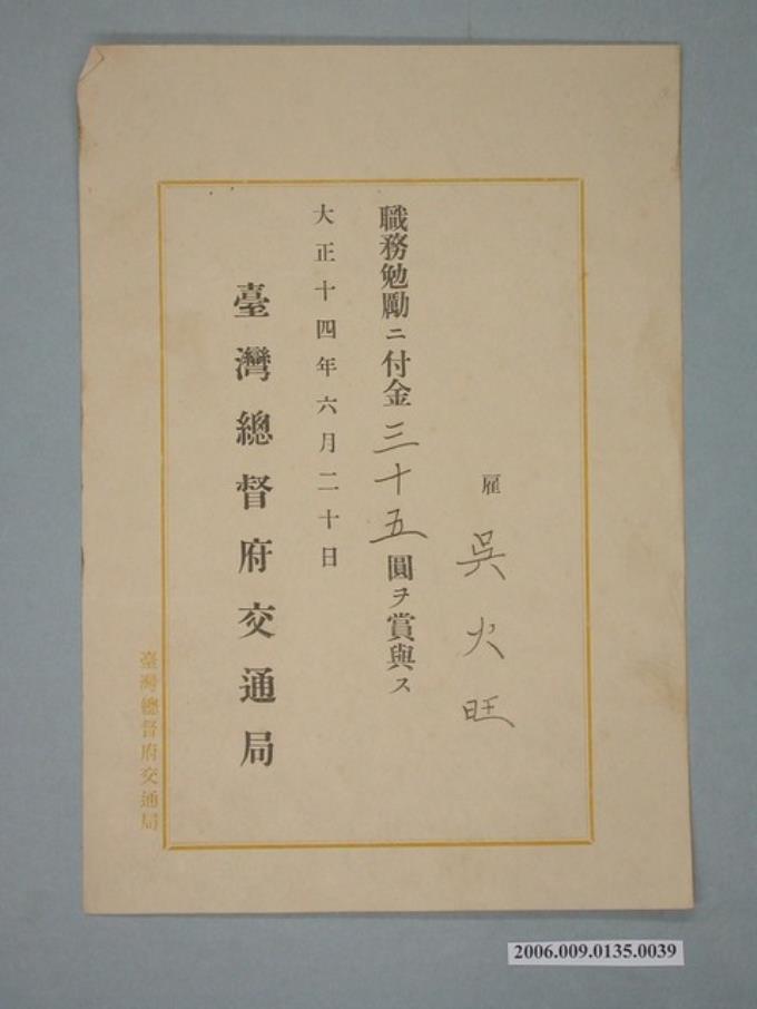 大正14年臺灣總督府交通局雇吳火旺職務勉勵金通知書