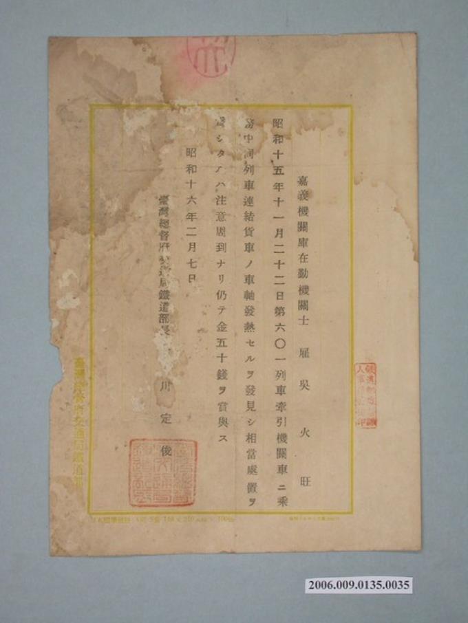 昭和16年臺灣總督府交通局鐵道部嘉義機關庫在勤機關士雇吳火旺獎賞通知書