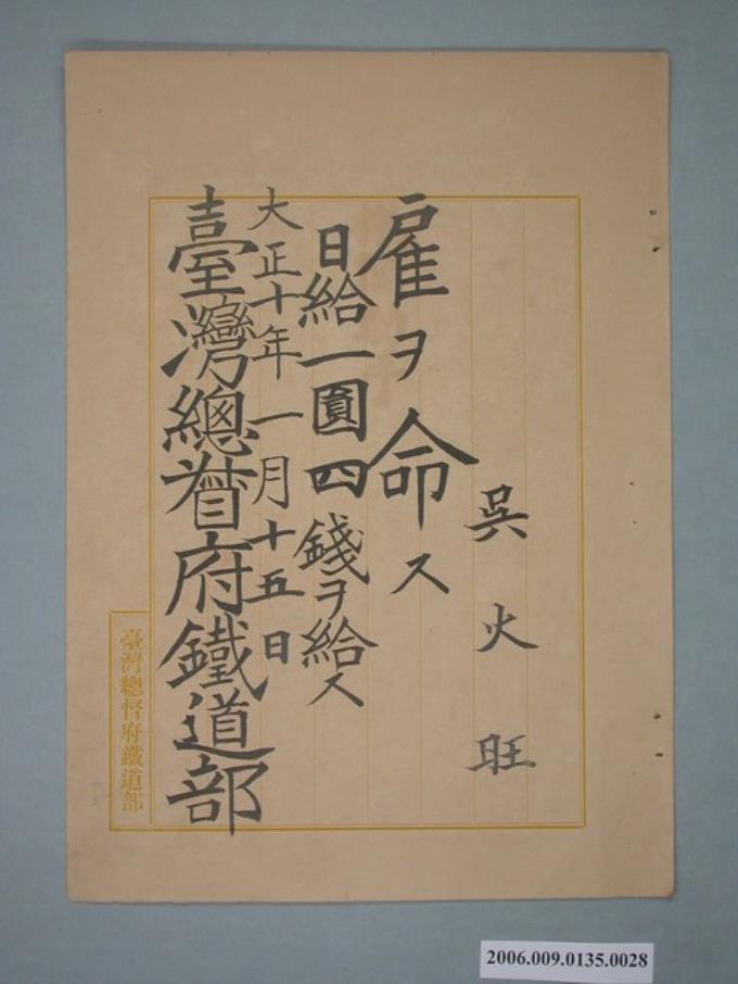 大正10年臺灣總督府鐵道部雇吳火旺任命書
