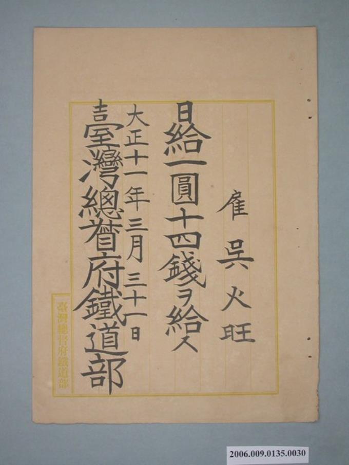 大正11年臺灣總督府鐵道部雇吳火旺薪水通知書