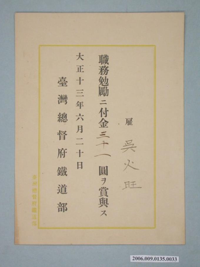 大正13年臺灣總督府鐵道部吳火旺職務勉勵金通知書