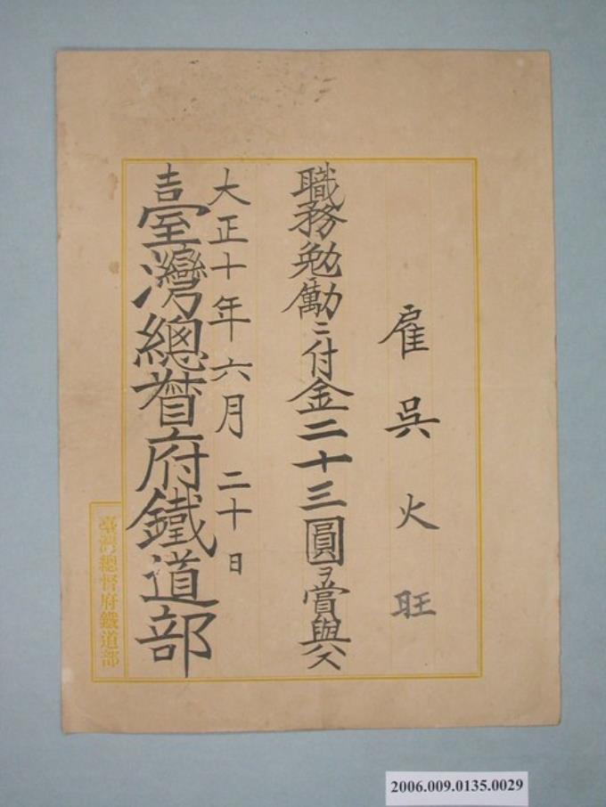 大正10年臺灣總督府鐵道部雇吳火旺職務勉勵金通知書