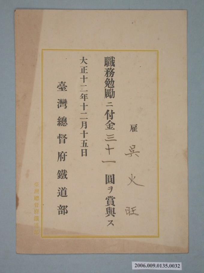 大正12年臺灣總督府鐵道部吳火旺職務勉勵金通知書