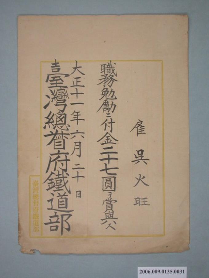 大正11年臺灣總督府鐵道部雇吳火旺職務勉勵金通知書