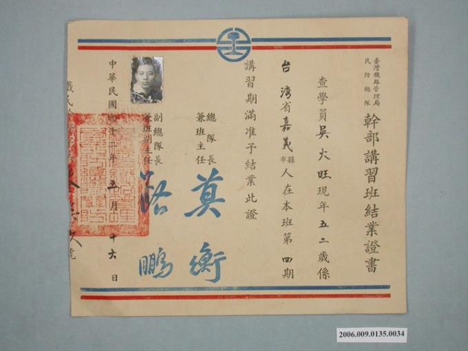 民國42年臺灣鐵路管理局民防總隊幹部講習班結業證書