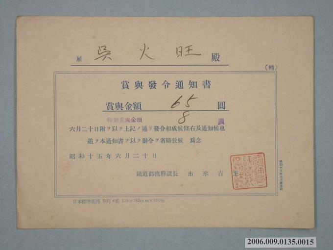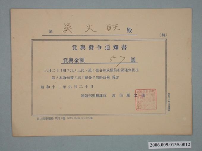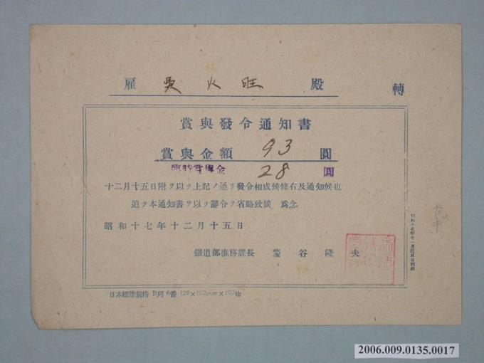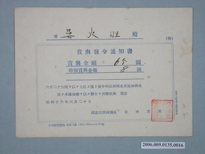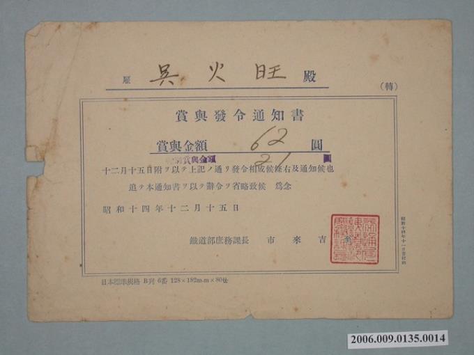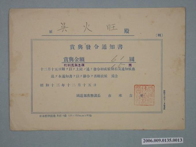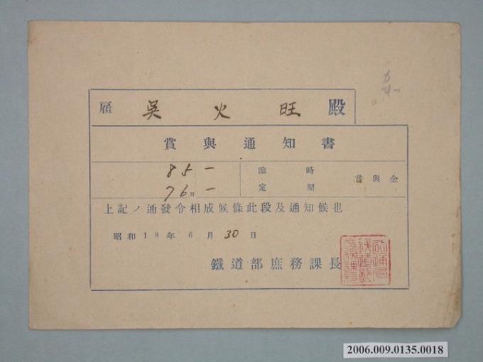 大正8年臺灣總督府鐵道部機關夫吳火旺任命通知書