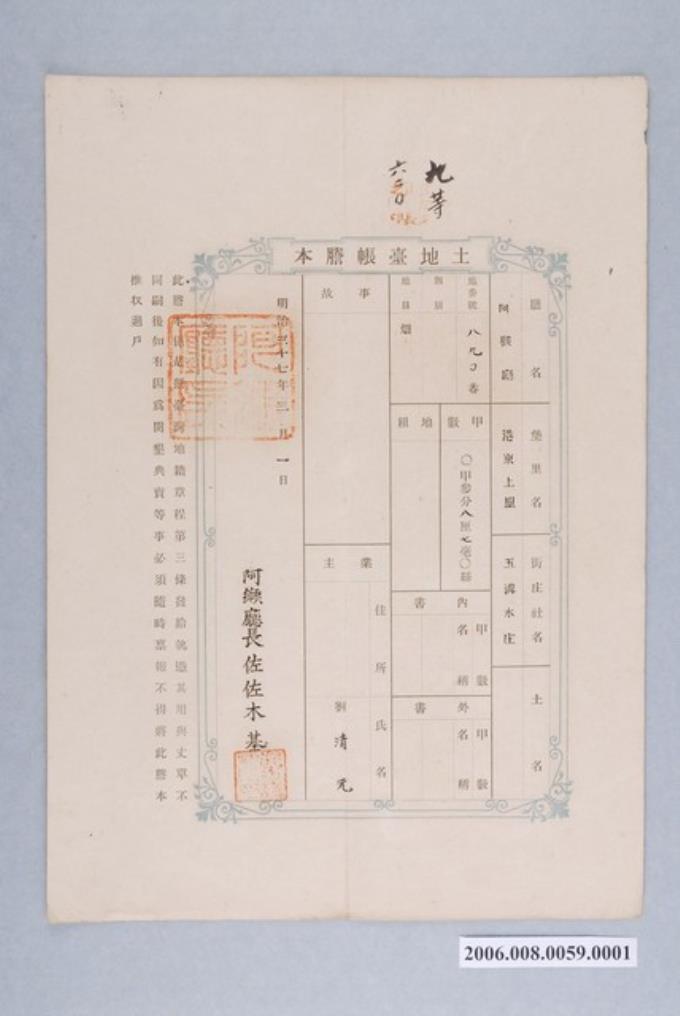 明治37年3月1日給業主劉清元阿猴廳港東上里五溝水庄土地臺帳謄本