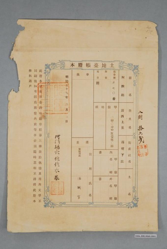 明治37年3月1日給業主溫國官阿猴廳港西上里高樹下庄土地臺帳謄本
