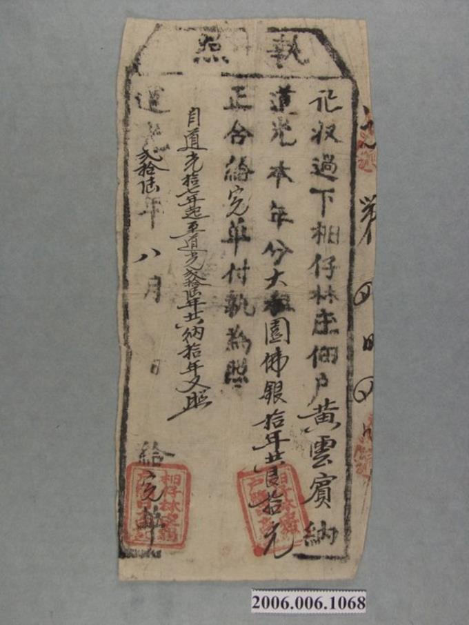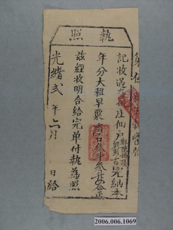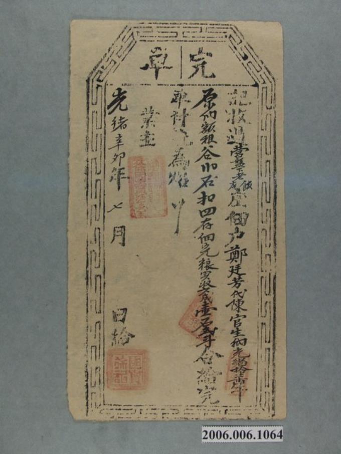 光緒2年金順利號給大溪墘庄佃戶納粟執照