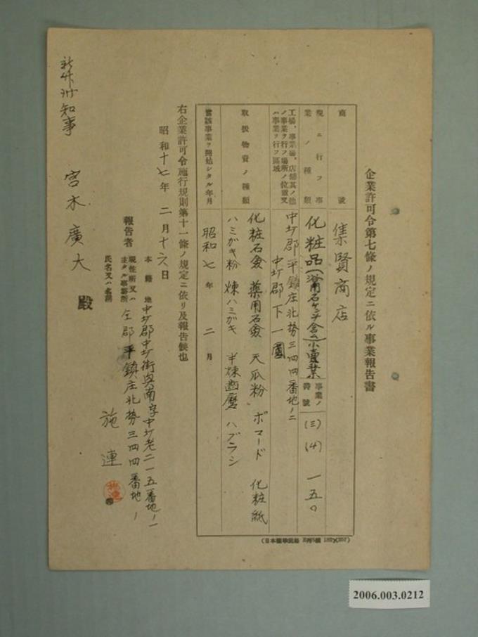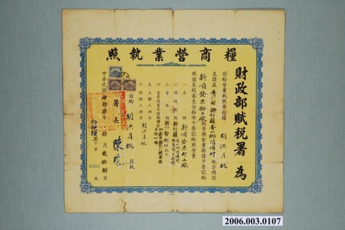 民國44年財政部賦稅署給新竹新順發米粉工廠糧商營業執照