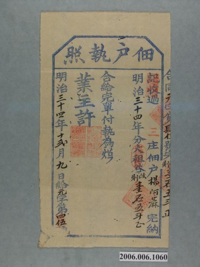 明治34年業主許給佃戶楊阿蔴佃戶執照