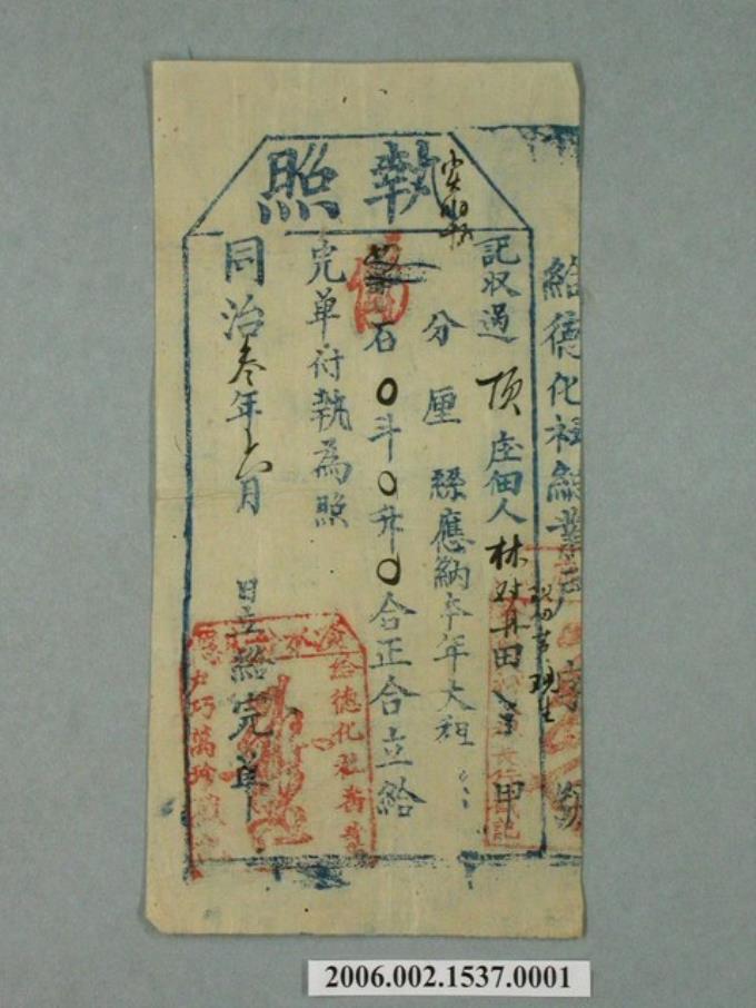 同治3年德化社總業戶給頂庄佃人林對繳納大租執照