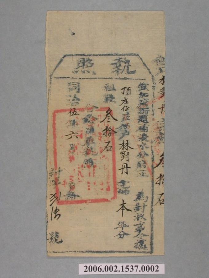 同治6年臺灣北路淡水分府同知給頂仔庄佃戶林對丹執照
