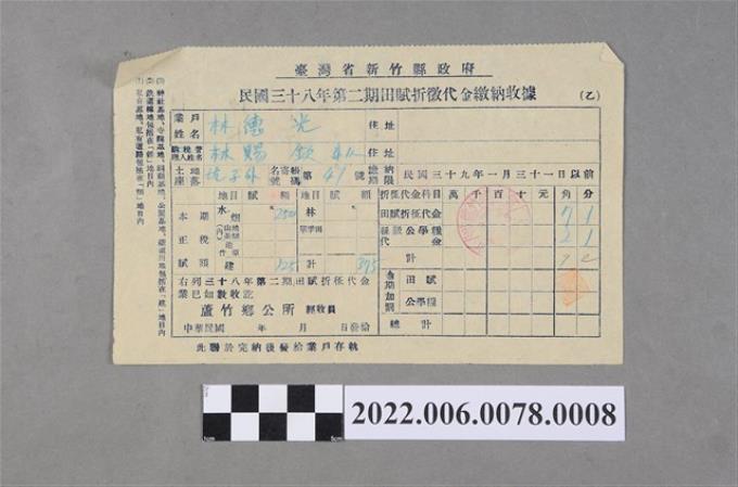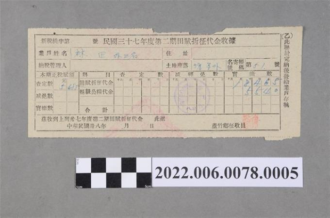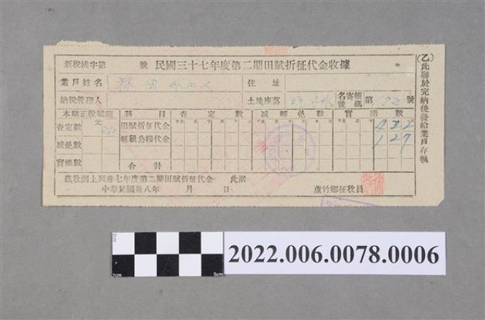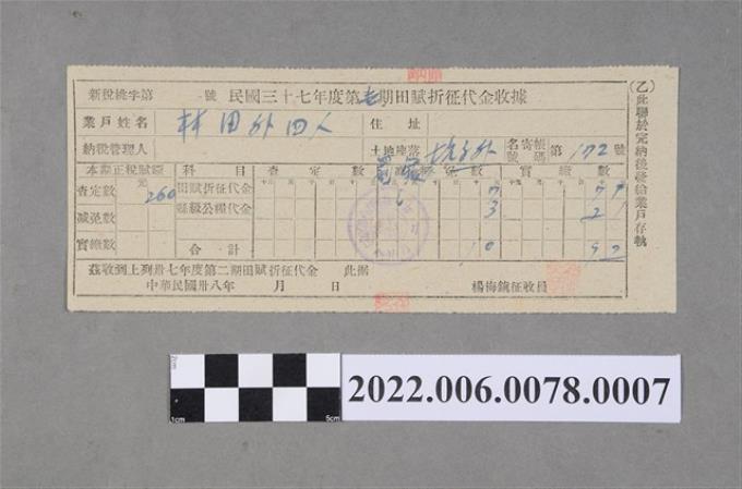 林田民國37年度第2期田賦折徵代金繳納收據第51號