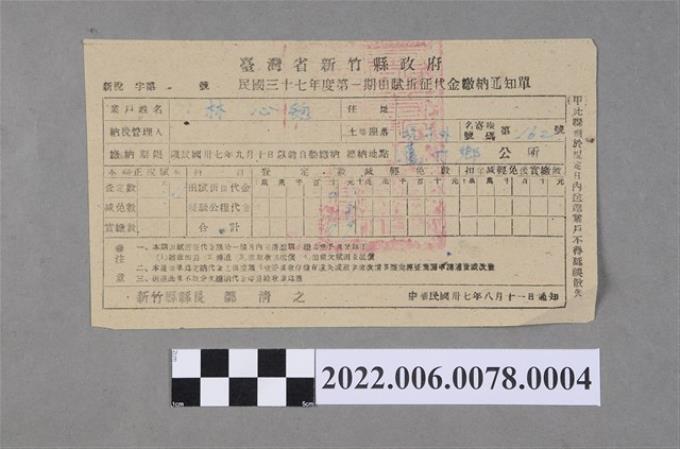 林心匏民國37年度第1期田賦折征代金繳納通知單