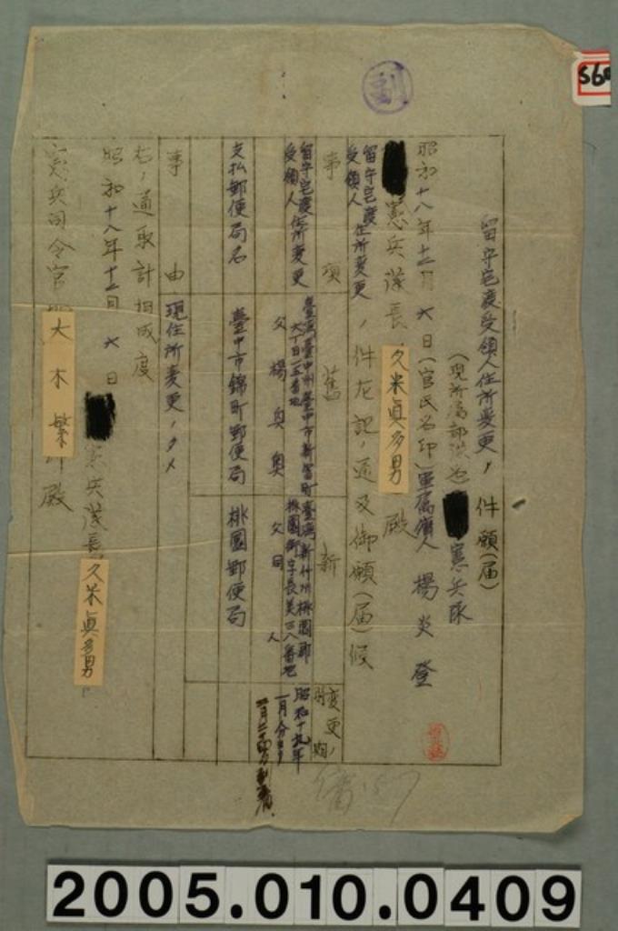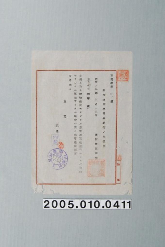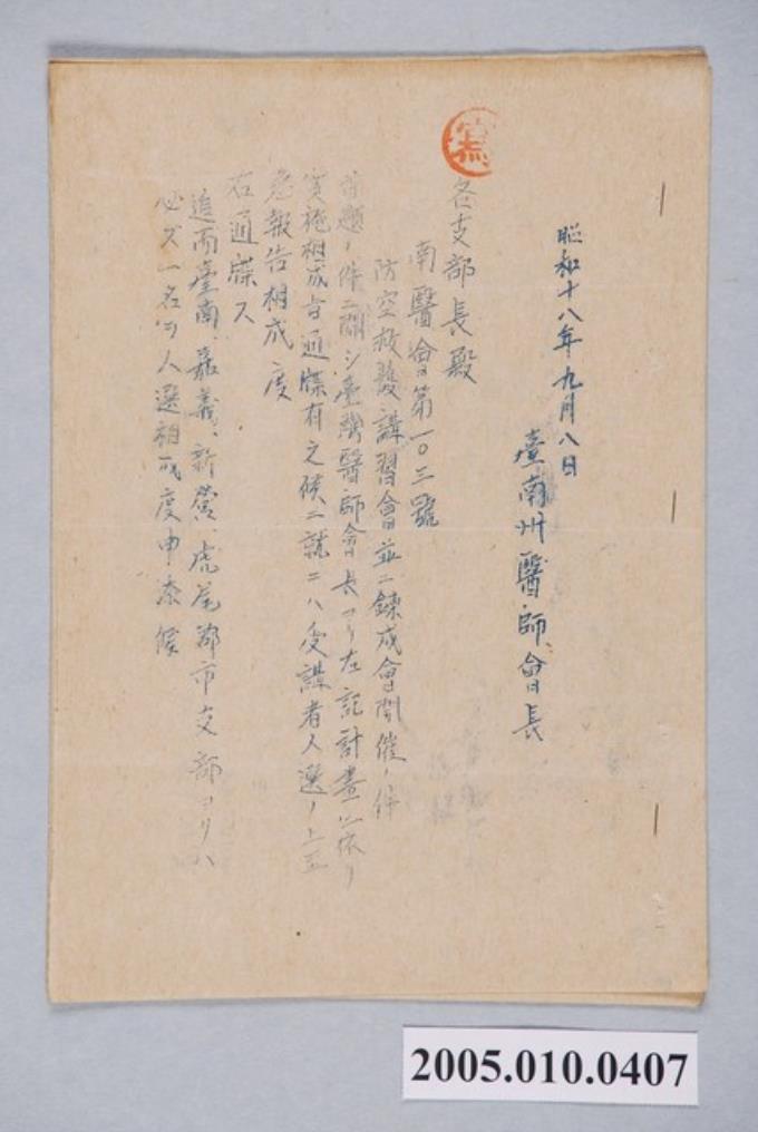 昭和15年臺南陸軍病院給臺南州知事陸軍除役退院患者通牒