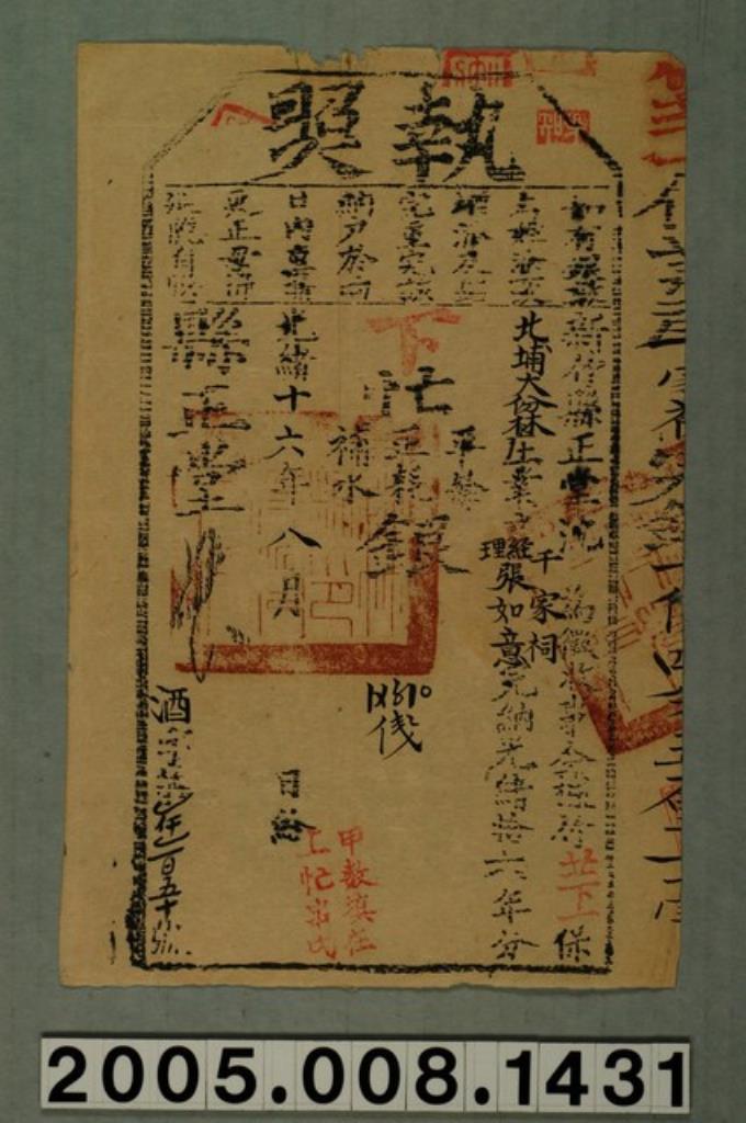 光緒16年新竹縣正堂給業戶千家祠經理張如意執照