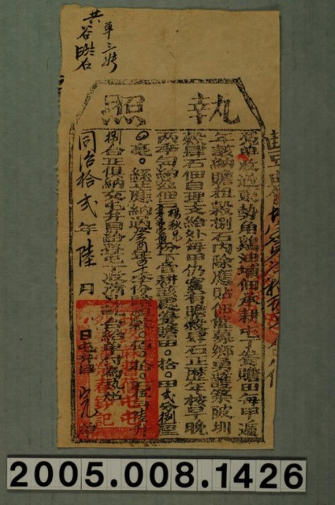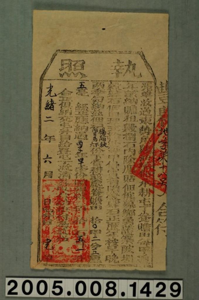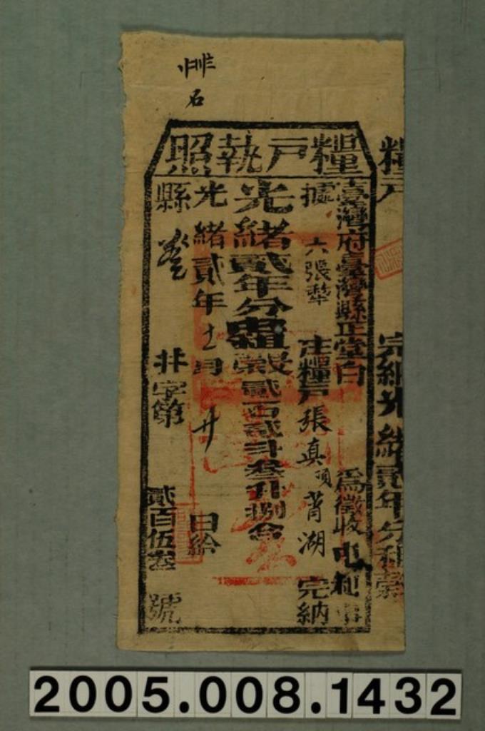 光緒2年臺灣府臺灣縣正堂給糧戶張貞頂莦湖執照