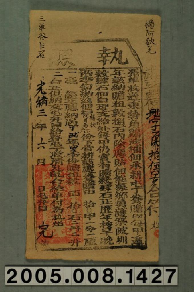 光緒3年蔴薯舊社屯外委潘榮春給楊秋承耕阿目馬下六屯田租穀完納執照
