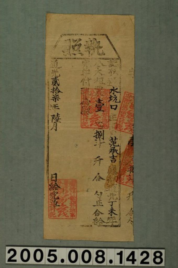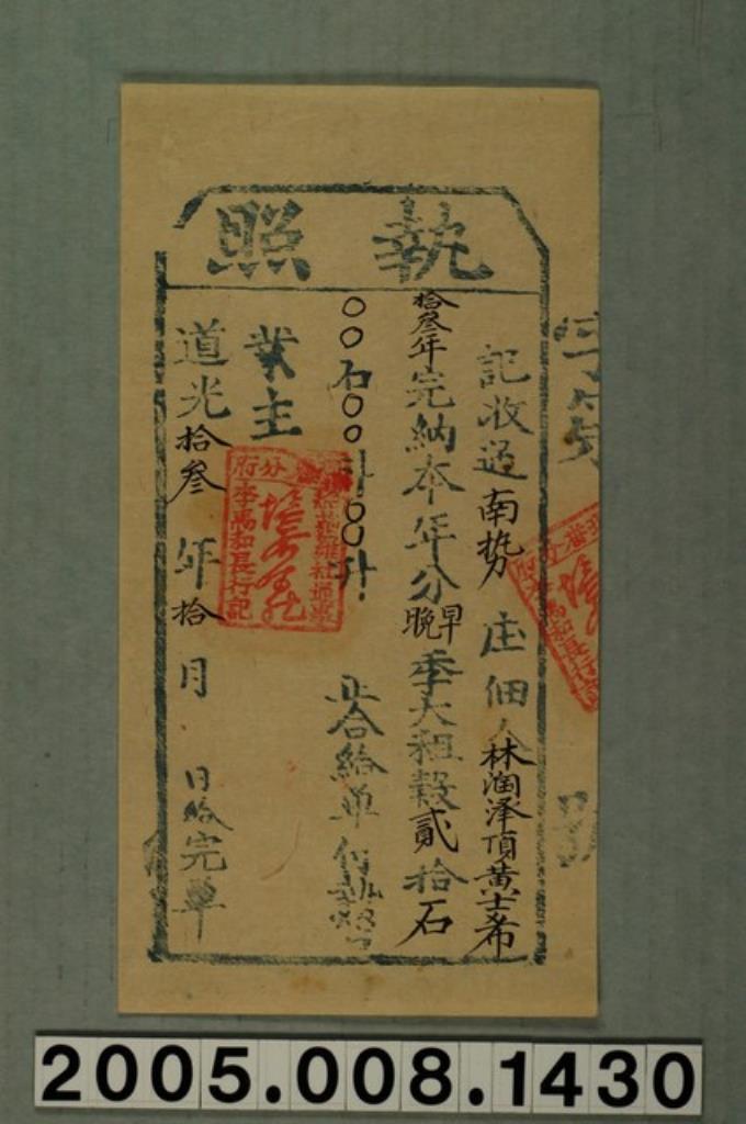 道光13年猫羅社通事給南勢庄佃人林漍□頂黃士希執照