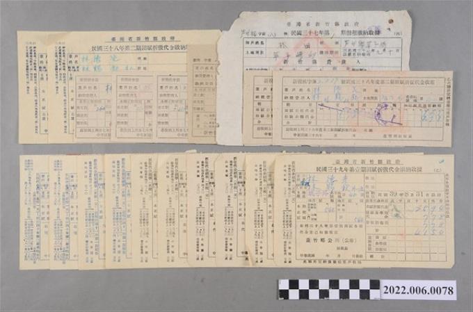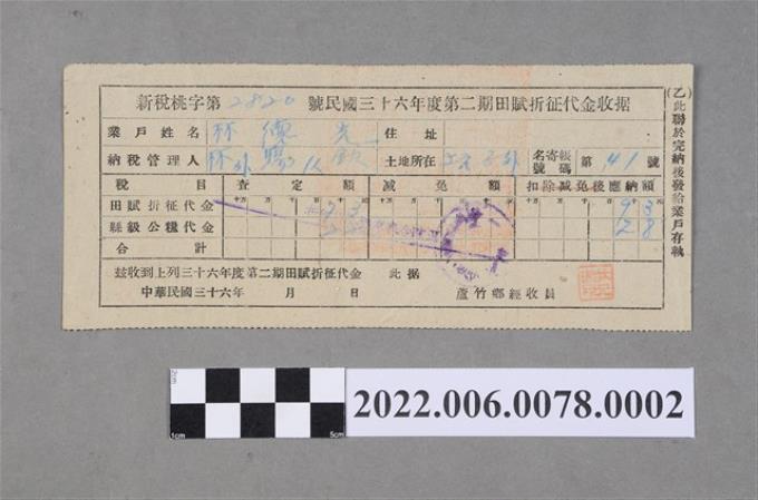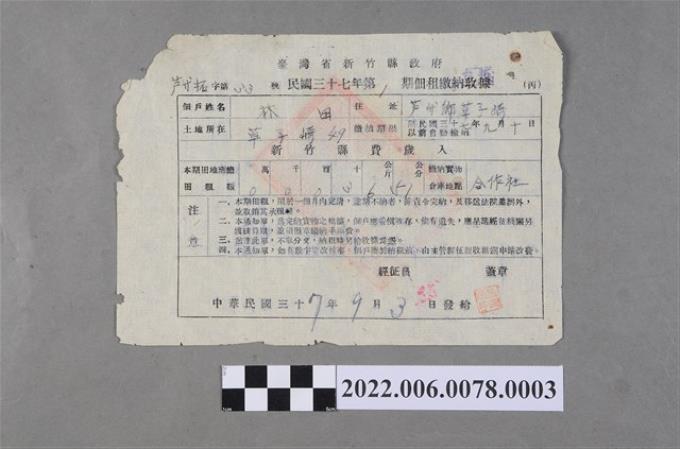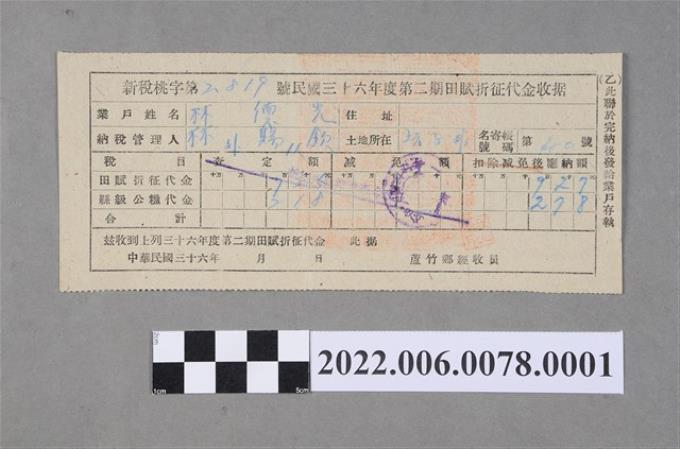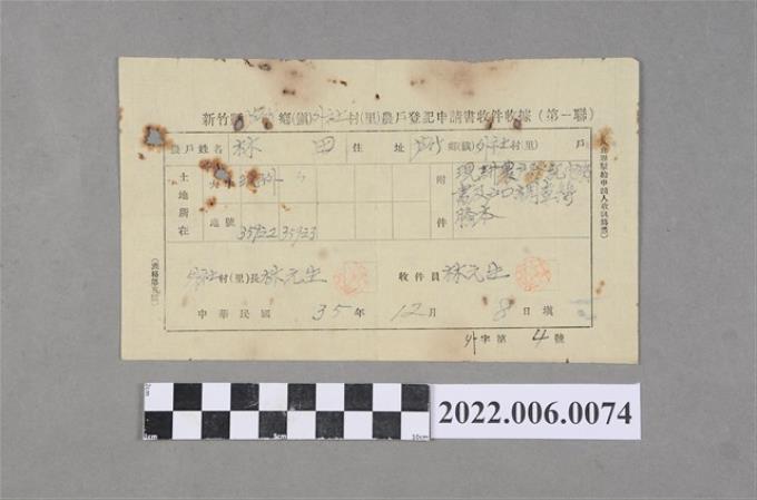 林田民國35年新竹縣蘆竹鄉外社村農戶登記申請書收件收據