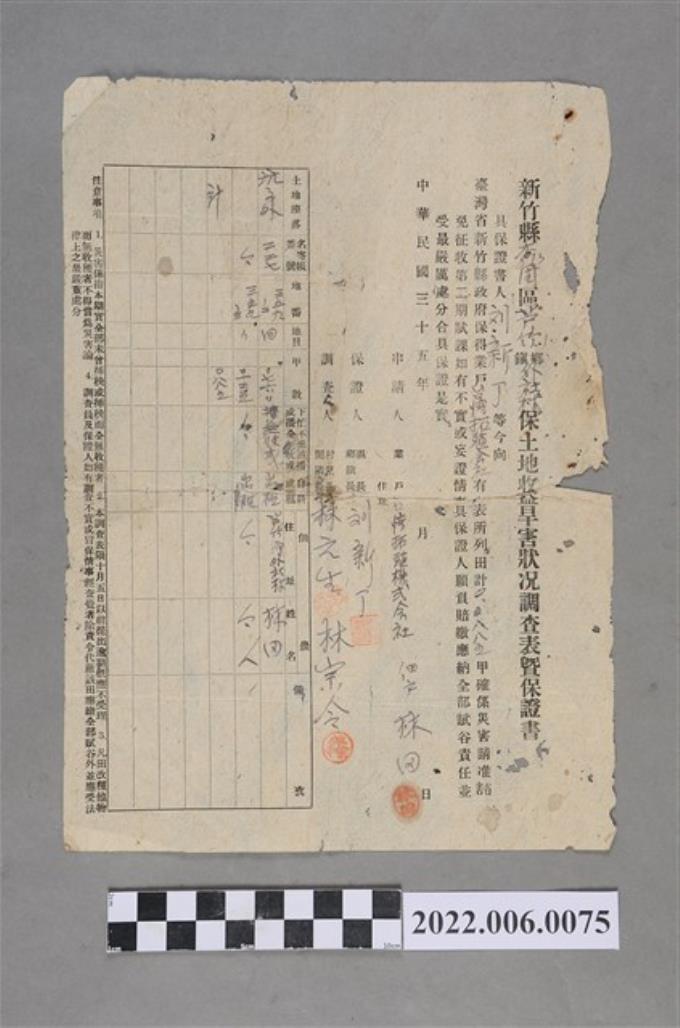 林田民國35年新竹縣桃園區蘆竹鄉外社村保土地收益旱害狀況調查表暨保證書