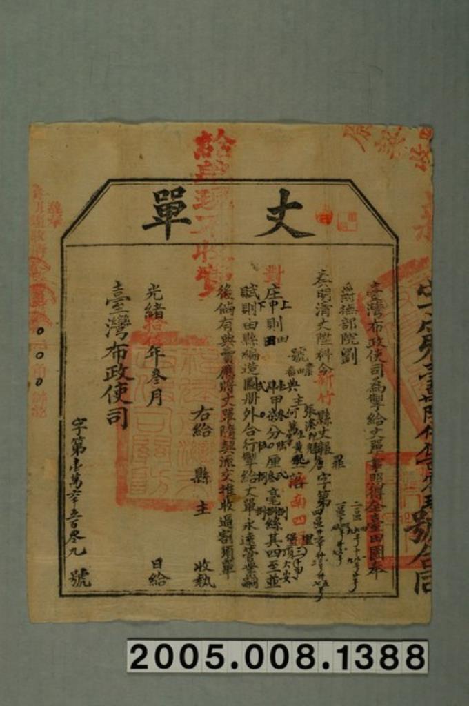 光緒14年臺灣布政使司給陳意丈單